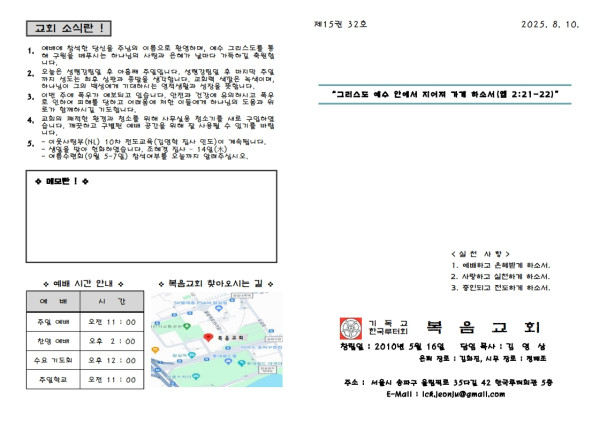 복음교회 주보 2025. 8. 10 작성자 정보 최고관리자 작성 작성일 2025.10.01 16:05 컨텐츠 정보 582 조회 목록 본문 2025. 8. 10 SNS 공유 관련자료 이전 2026년 3월29일 작성일 2026.04.04 09:06 댓글 0 등록된 댓글이 없습니다. 로그인한 회원만 댓글 등록이 가능합니다. 목록